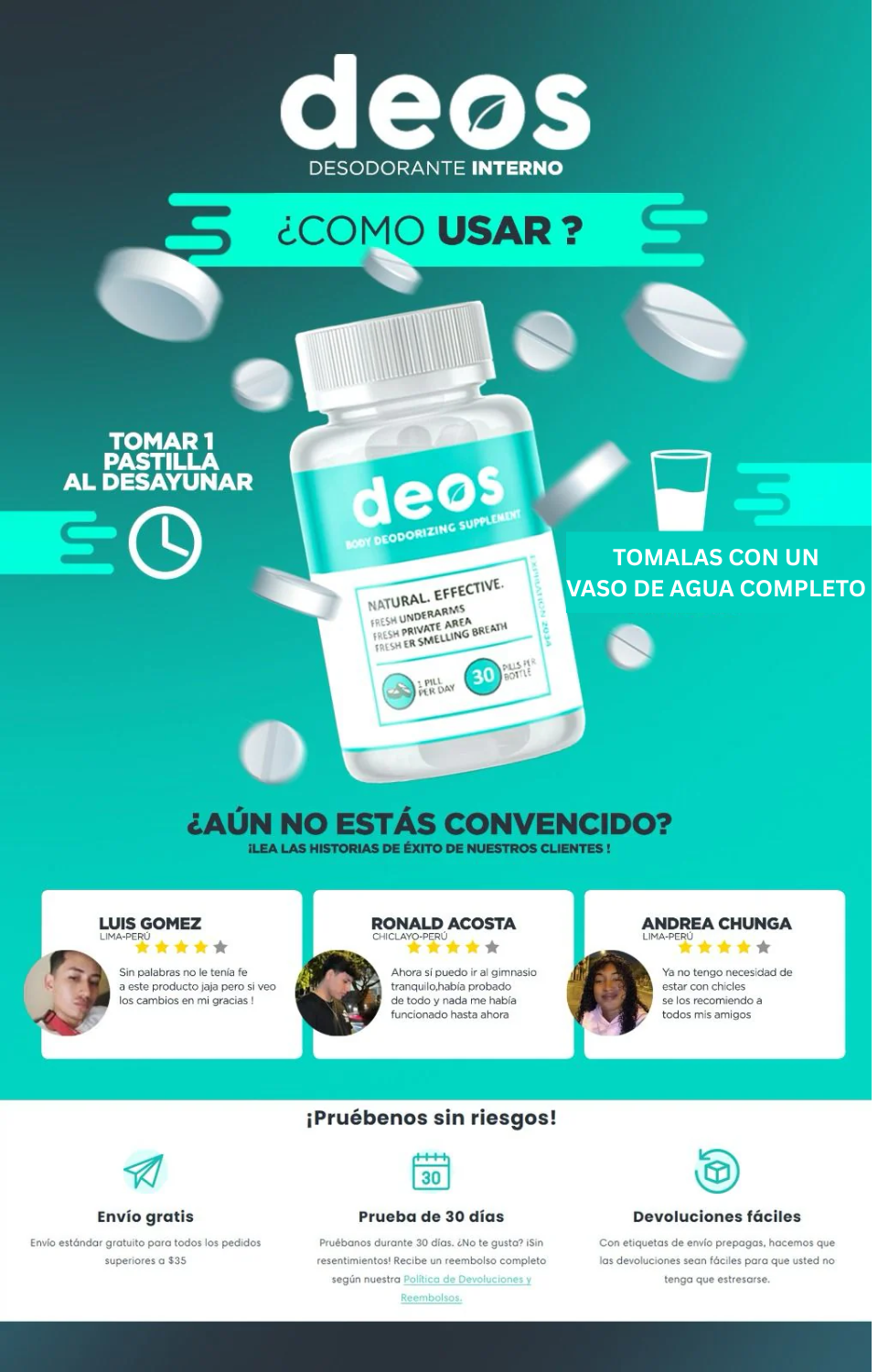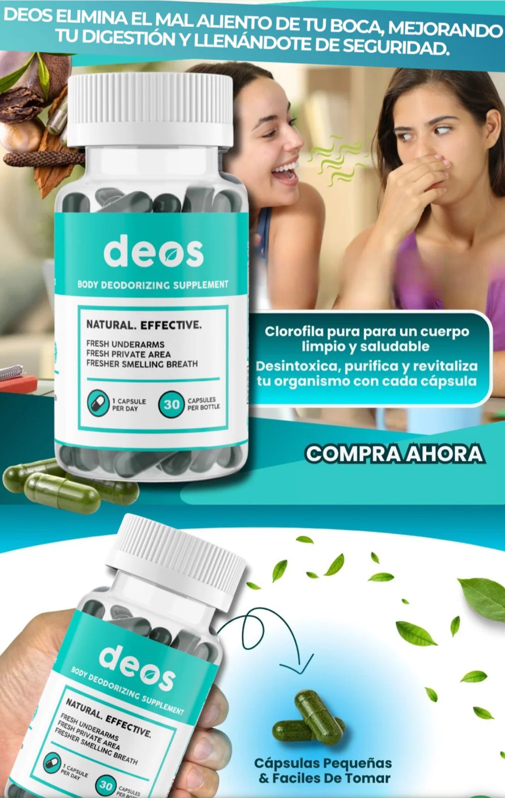 Olvídate de los desodorantes que solo tapan el problema por unas horas. El mal olor empieza dentro de tu cuerpo, y por eso DEOS actúa desde la raíz: su fórmula a base de extractos naturales y antioxidantes limpia tu organismo y regula el pH interno para que tu propio cuerpo deje de generar mal olor.
