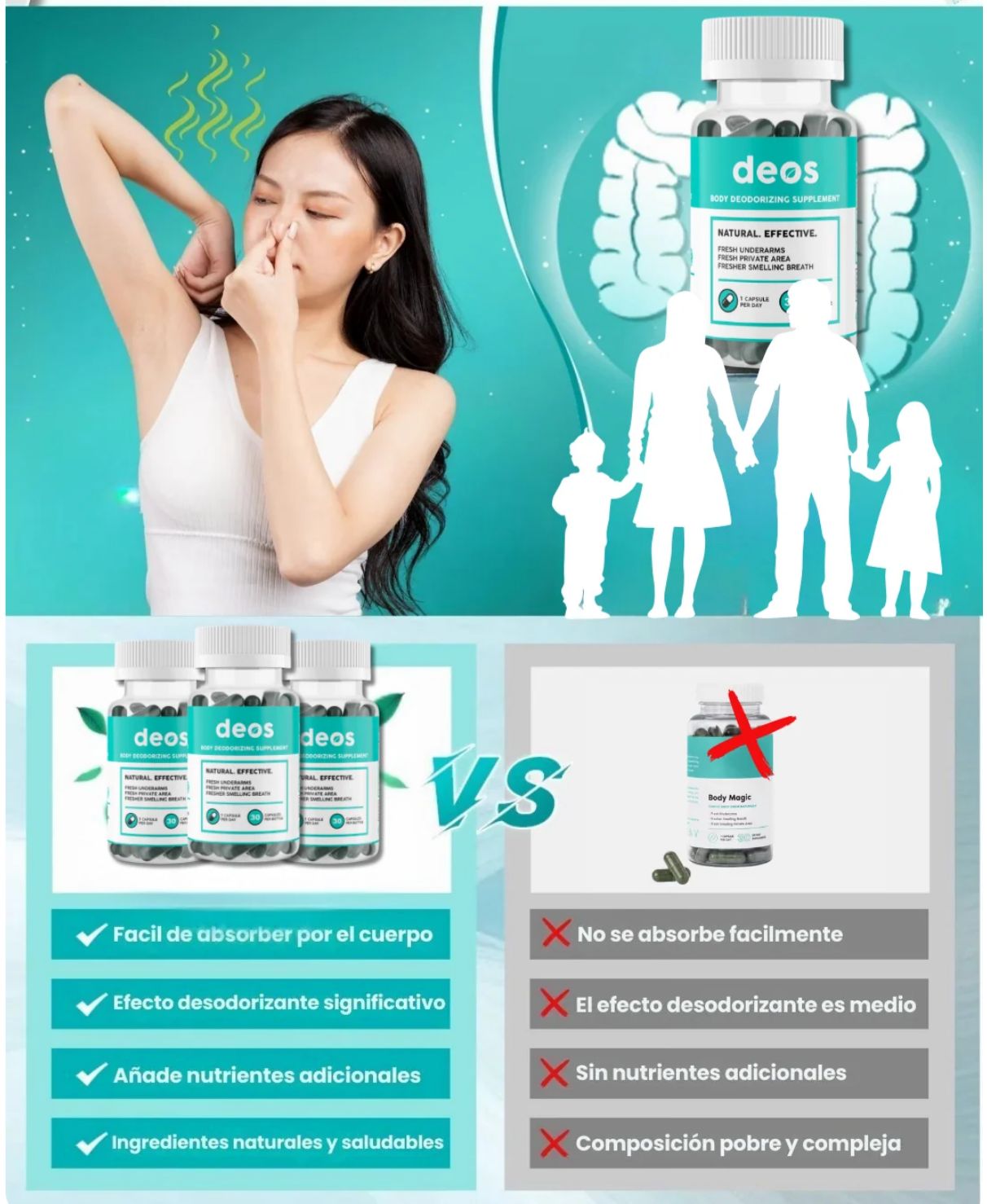 DEOS no es un desodorante común. En lugar de enmascarar olores con químicos o fragancias artificiales, actúa desde el interior de tu cuerpo, neutralizando las toxinas que generan mal olor. 🌿 Con solo 1 cápsula al día, te mantiene fresco en axilas, aliento y zona íntima, sin necesidad de reaplicar cada pocas horas.